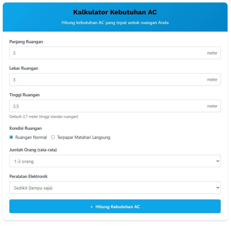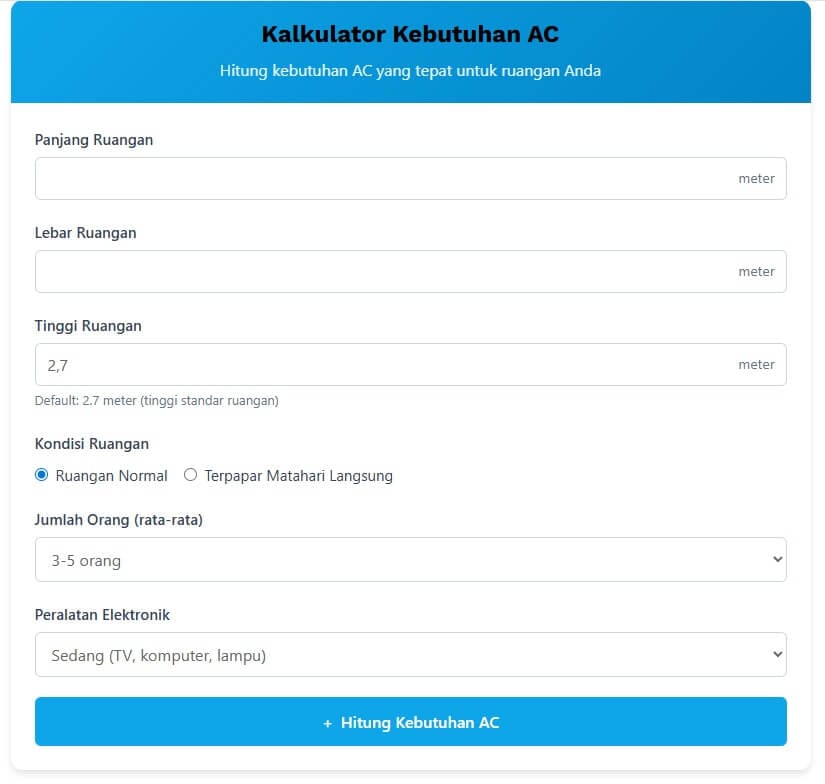 Kalkulator AC mempertimbangkan semua faktor penting untuk memberikan hasil yang akurat, menghindari pemborosan energi, dan memastikan AC bekerja dengan optimal.