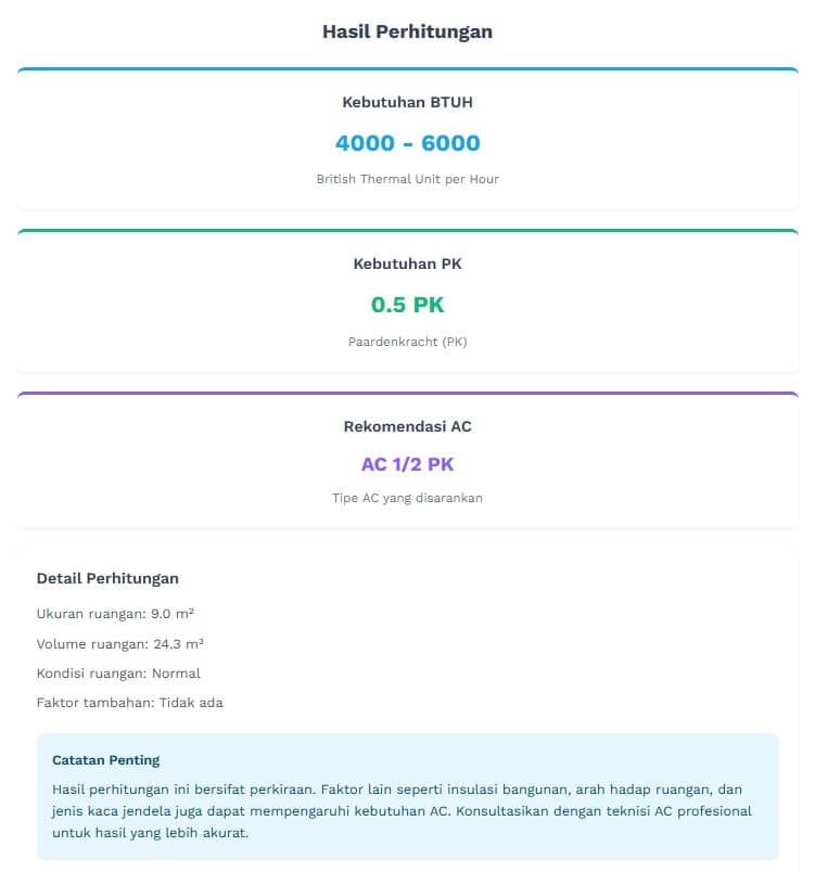 Setelah Anda memasukkan semua informasi tersebut, Kalkulator AC akan secara otomatis menghitung kapasitas pendinginan atau kebutuhan BTU yang ideal untuk ruangan Anda. Anda akan mendapatkan rekomendasi ukuran AC yang paling sesuai.