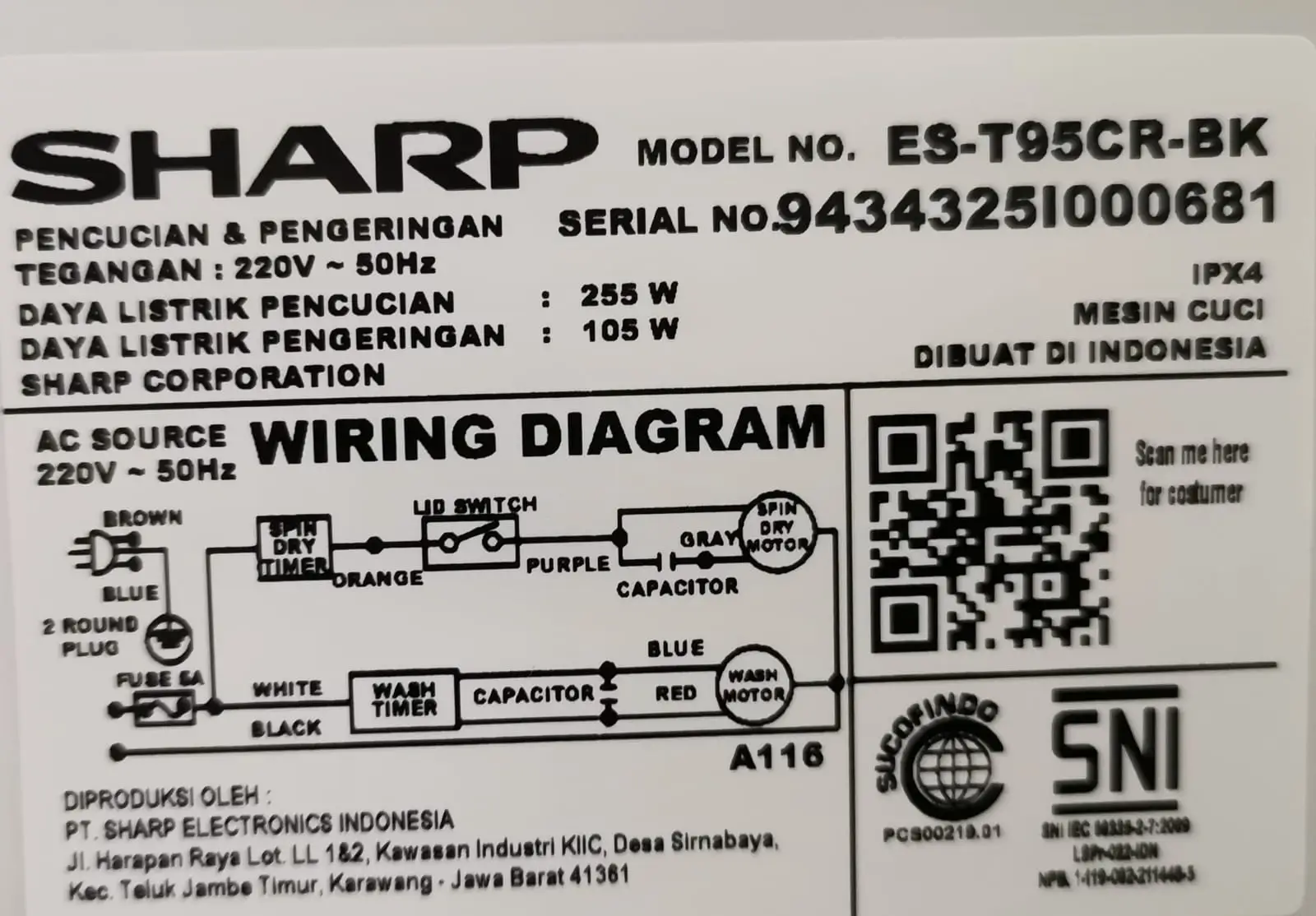 - Daya tertera 255W (cuci) dan 105W (spin). Efisiensi bergantung durasi dan beban cucian.