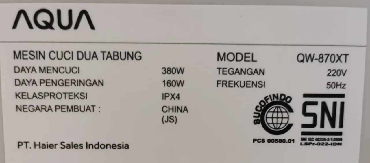 - Konsumsi daya: Cuci 380 W | Spin 160 W