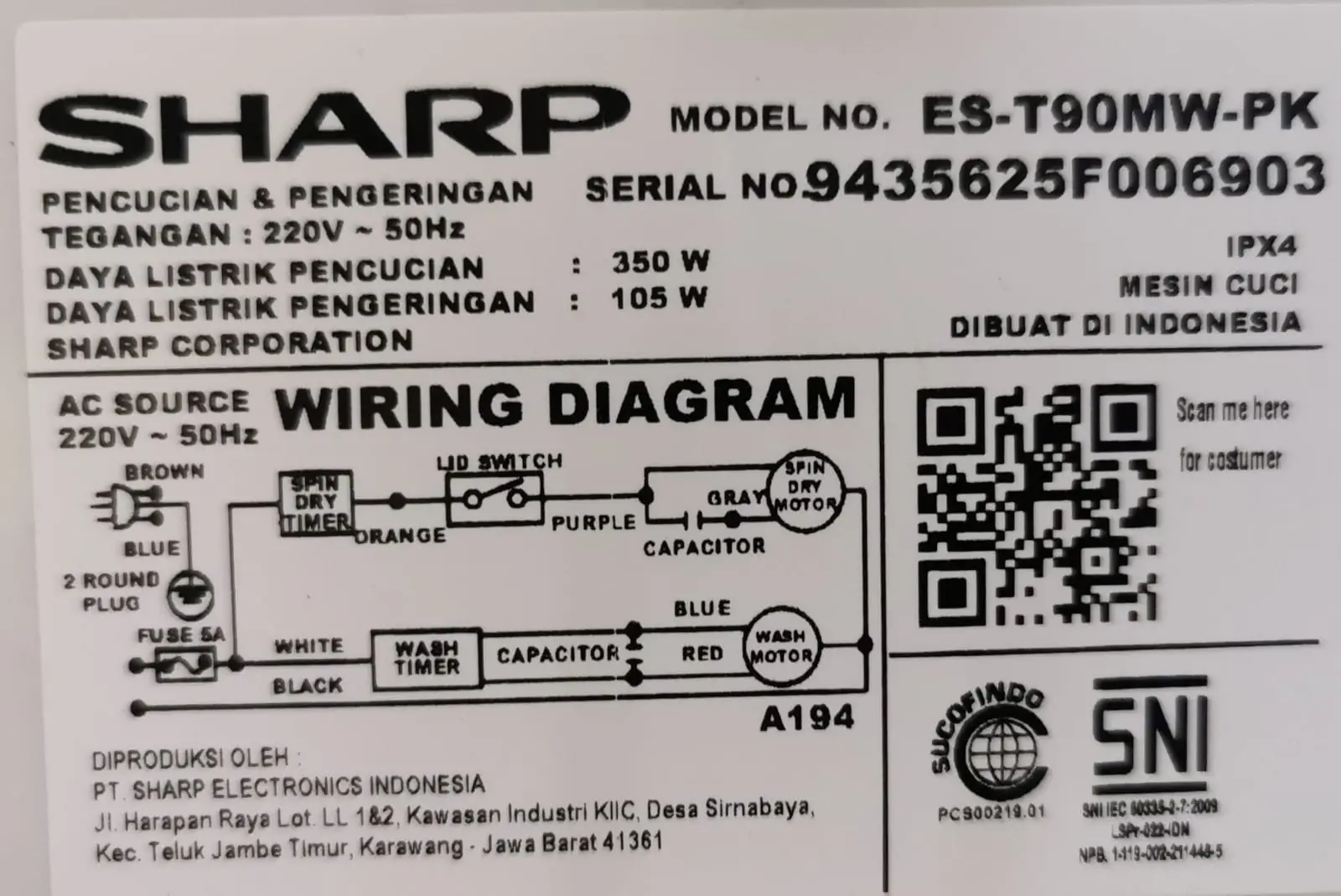 List spesifikasi ini menunjukkan bahwa ukuran fisik ES-T90MW masih masuk akal untuk rumah tipe 36–72 di kawasan padat seperti Depok dan Cibinong, selama tersedia area khusus laundry minimal sekitar 1 meter lebar.