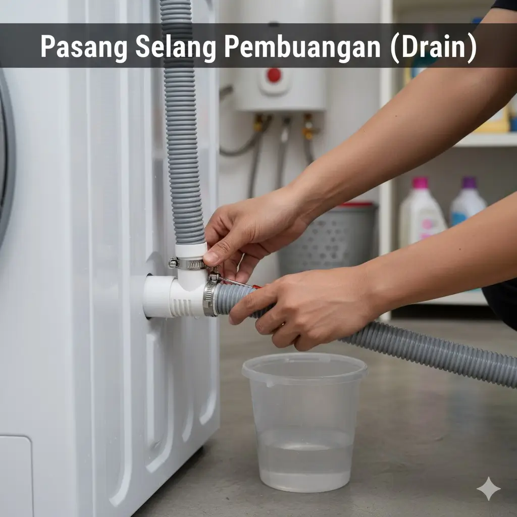 - Sambungkan selang drain: Pasangkan selang pembuangan ke lubang outlet dengan sambungan yang erat.