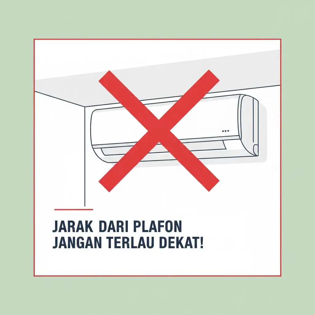 Menurut Standar BPS SNI 6390:2020 tentang konservasi energi sistem tata udara, sirkulasi udara panas dari atas rumah Anda (terutama di siang hari) akan tertarik ke unit jika dipasang terlalu dekat plafon. Ini menyebabkan AC bekerja ekstra keras. Dengan jarak yang cukup, AC dapat menarik udara yang sudah optimal dan tidak tersiksa.