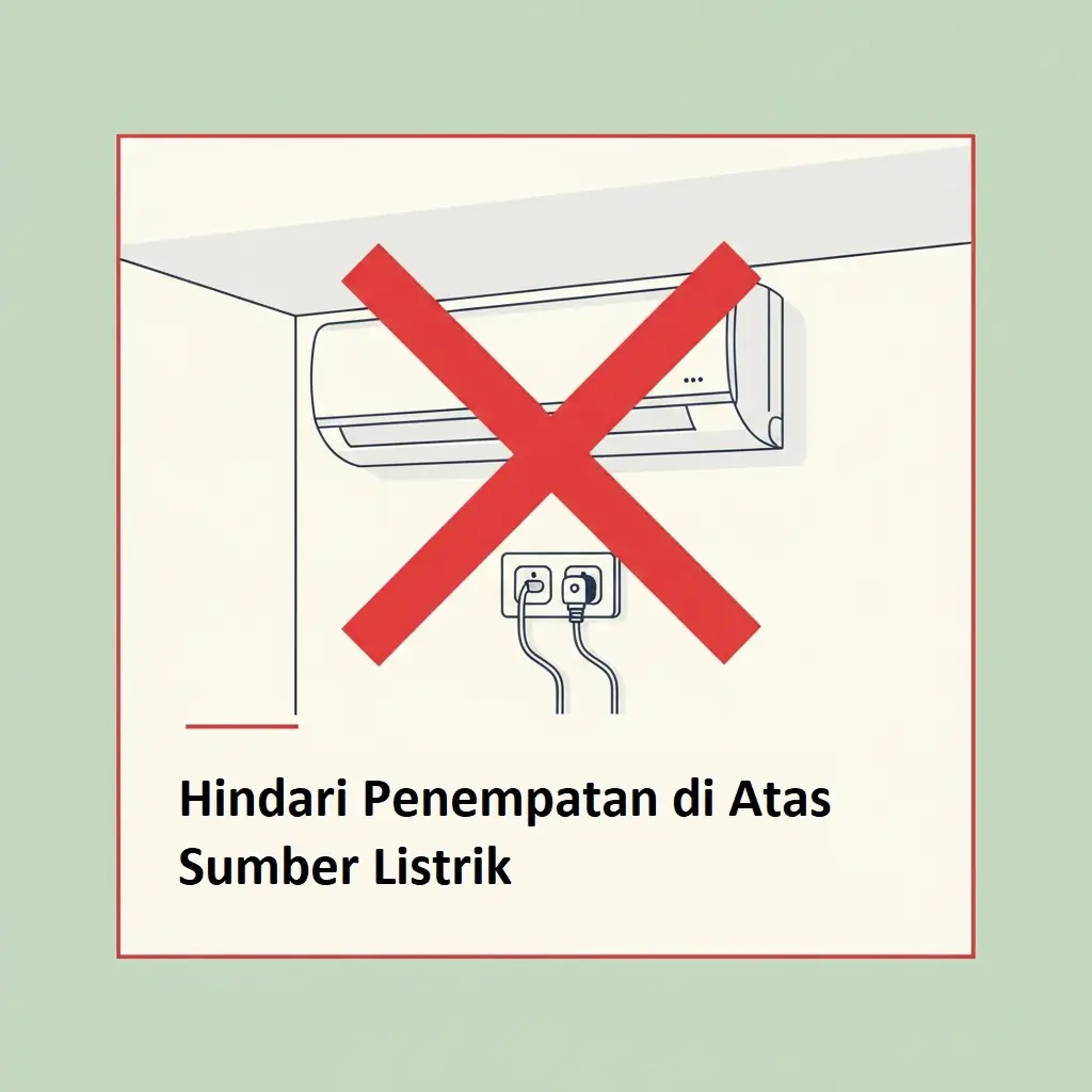Menurut tokoprogress.com, penempatan semacam ini tidak hanya risiko keamatan (potensi kebocoran air mengenai alat listrik), tetapi juga membuat AC menghembuskan udara yang sudah terkontaminasi panas dari sumber lain, menurunkan efisiensi hingga 20%.
