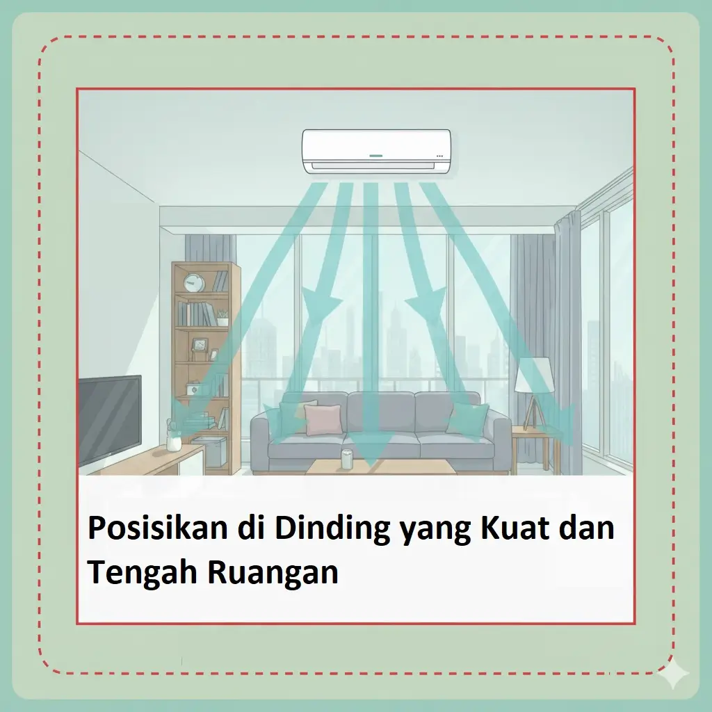 Jika ruangan Anda cukup besar (> 20 m²), pertimbangkan penempatan di dinding yang memungkinkan udara dingin memantul ke seluruh penjuru sebelum keluar melalui jendela atau pintu.