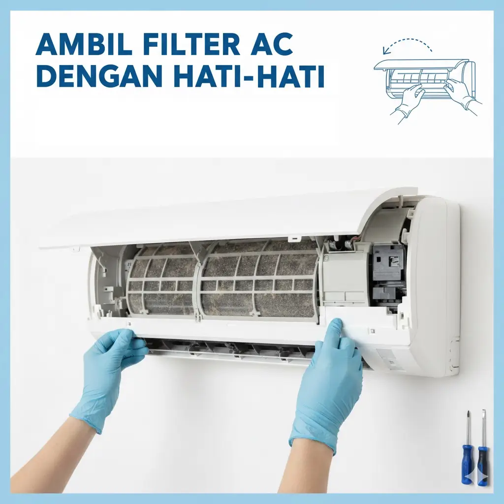 Setelah panel terbuka, Anda akan melihat filter AC—biasanya terlihat seperti lembaran sintetis tebal berwarna putih atau abu-abu. Tarik filter keluar secara perlahan dan hati-hati. Jangan tarik paksa, karena filter bisa mengalami kerusakan atau bahkan merusak komponen lain di dalam unit.