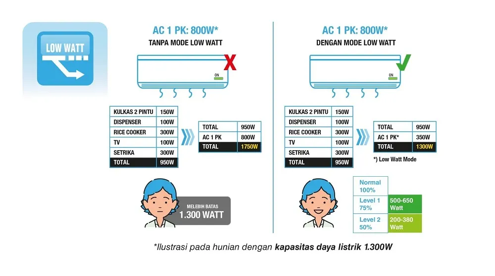 Mode watt rendah memungkinkan arus berjalan maksimum dari AC harus diganti dengan sentuhan tombol