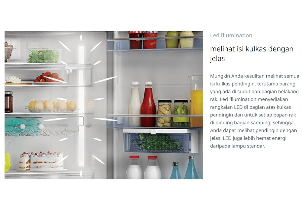 Mungkin Anda kesulitan melihat semua isi kulkas pendingin, terutama barang yang ada di sudut dan bagian belakang rak. Led Illumination menyediakan rangkaian LED di bagian atas kulkas pendingin dan untuk setiap papan rak di dinding bagian samping, sehingga Anda dapat melihat pendingin dengan jelas. LED juga lebih hemat energi daripada lampu standar.