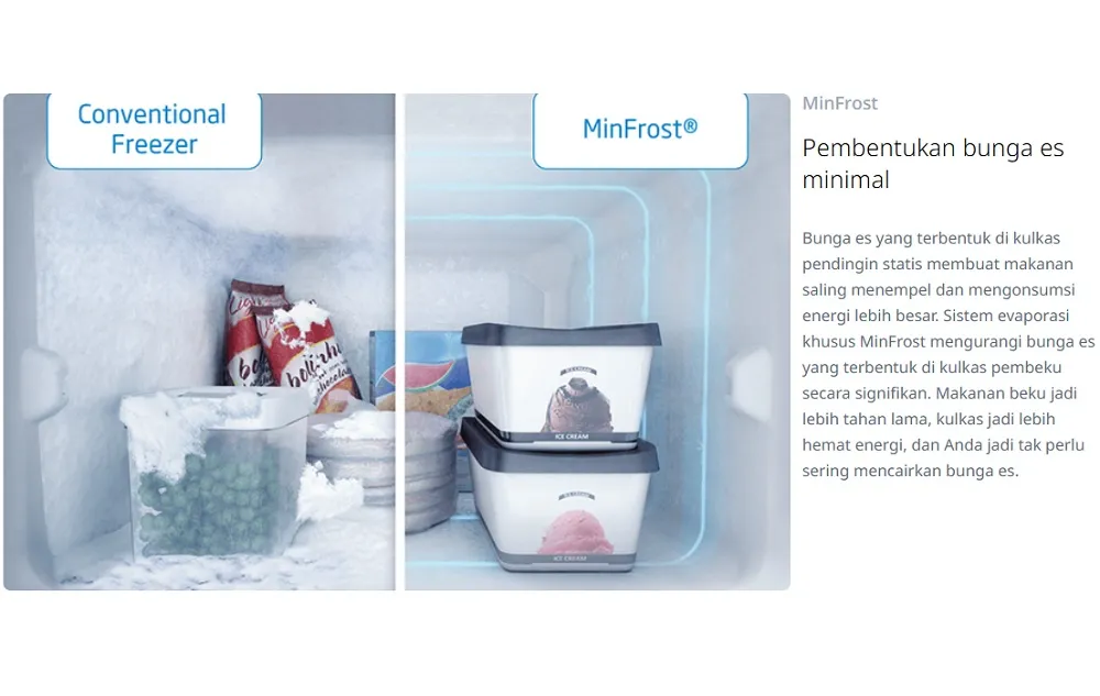 Bunga es yang terbentuk di kulkas pendingin statis membuat makanan saling menempel dan mengonsumsi energi lebih besar