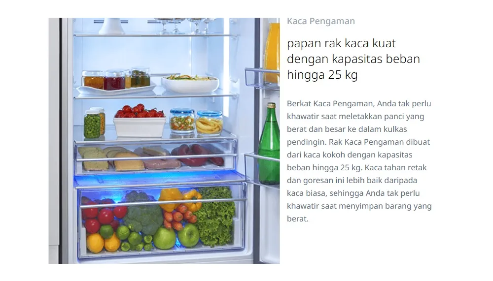 Berkat Kaca Pengaman, Anda tak perlu khawatir saat meletakkan panci yang berat dan besar ke dalam kulkas pendingin