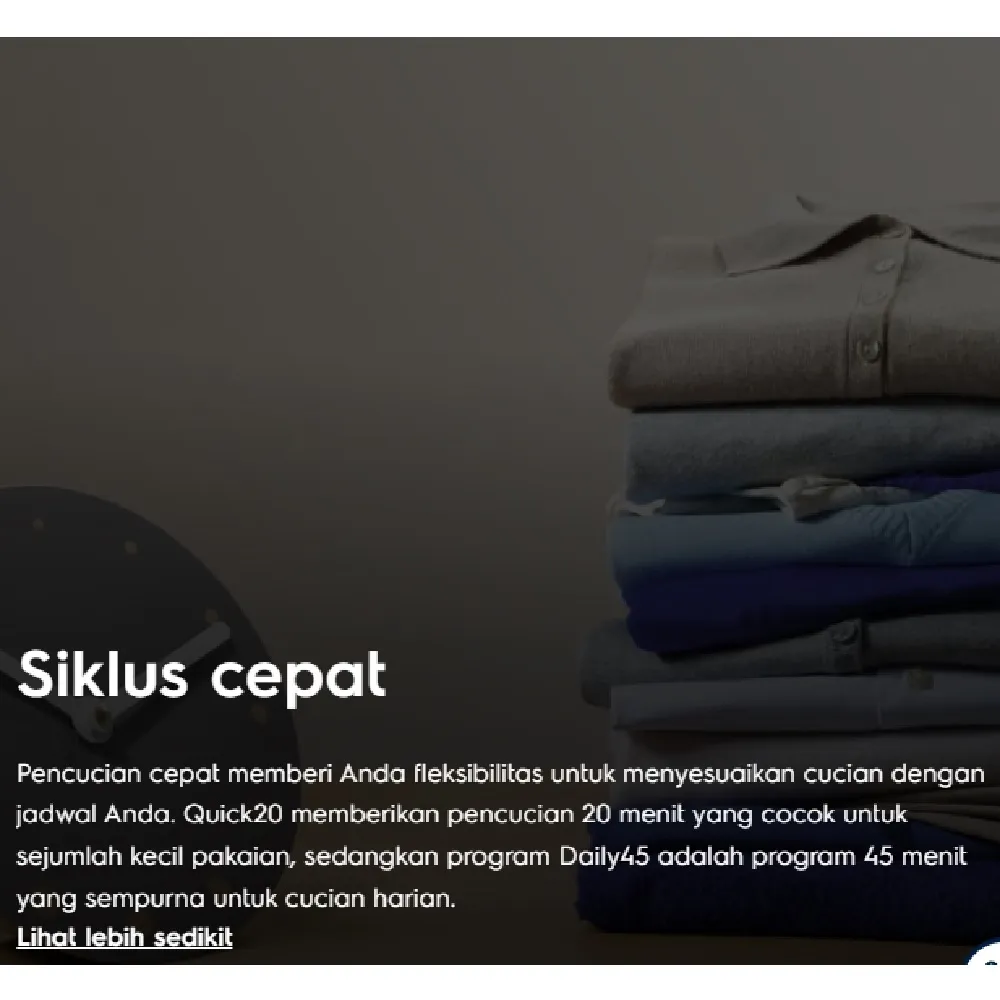 – Pencucian cepat memberi Anda fleksibilitas untuk menyesuaikan cucian dengan jadwal Anda. Quick20 memberikan pencucian 20 menit yang cocok untuk sejumlah kecil pakaian, sedangkan program Daily45 adalah program 45 menit yang sempurna untuk cucian harian