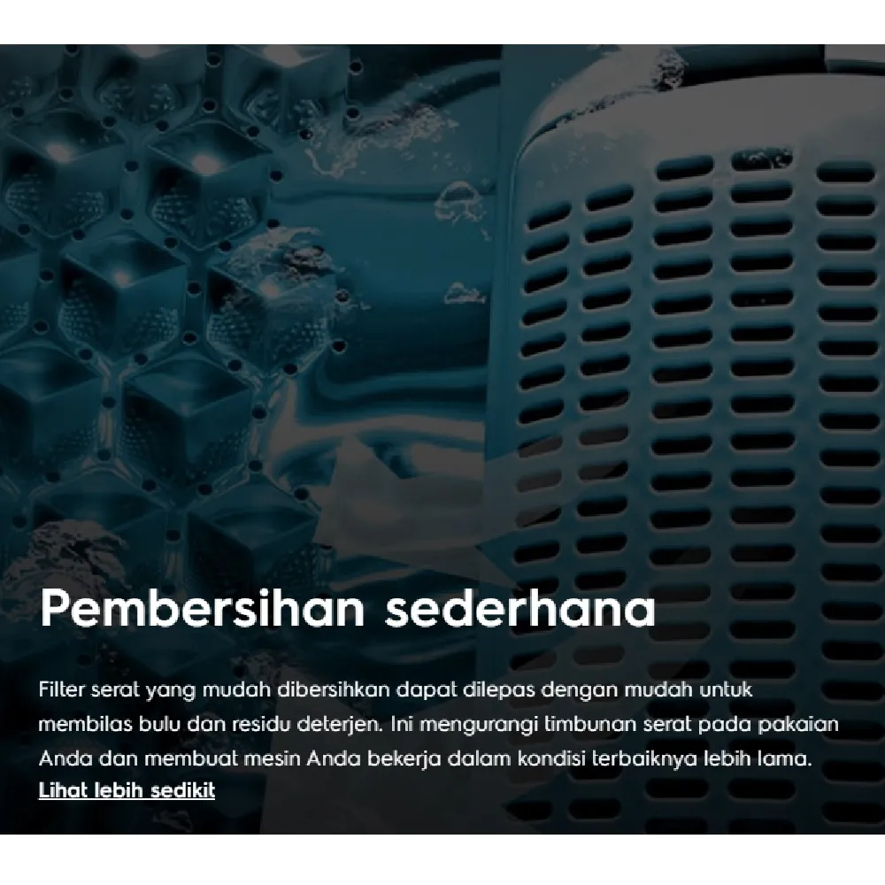 – Filter serat yang mudah dibersihkan dapat dilepas dengan mudah untuk membilas bulu dan residu deterjen