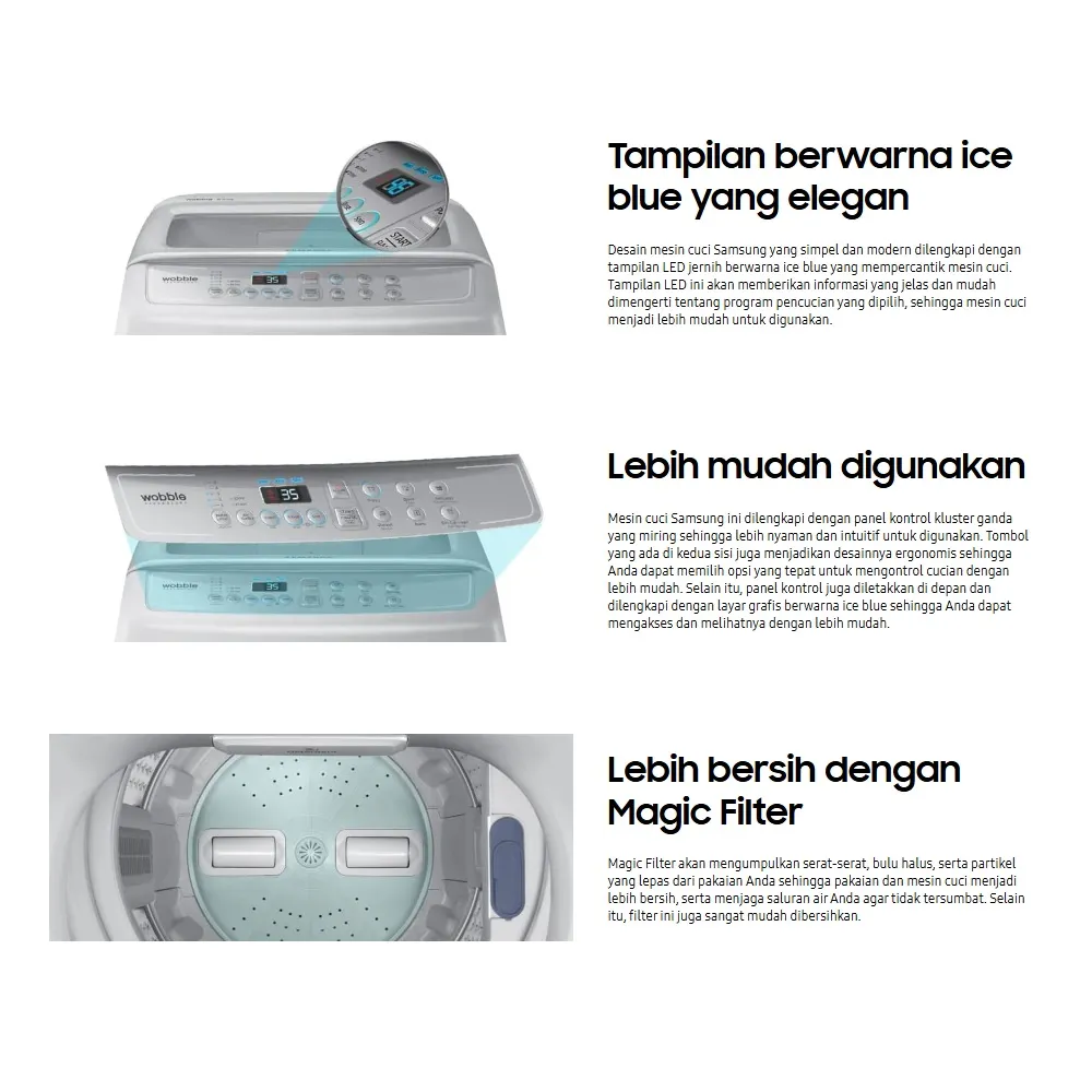 – Desain mesin cuci yang modern dan simpel dilengkapi dengan tampilan LED jernih berwarna ice blue yang akan mempercantik mesin cuci Anda